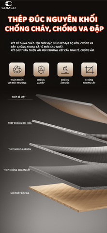 - Toàn bộ thân và cánh cửa CRMCR 65JB được đúc từ thép vi carbon Q345 - tương đương chất liệu tháp Eiffel, không mối hàn, tăng độ bền và khả năng chịu lực va đập mạnh.