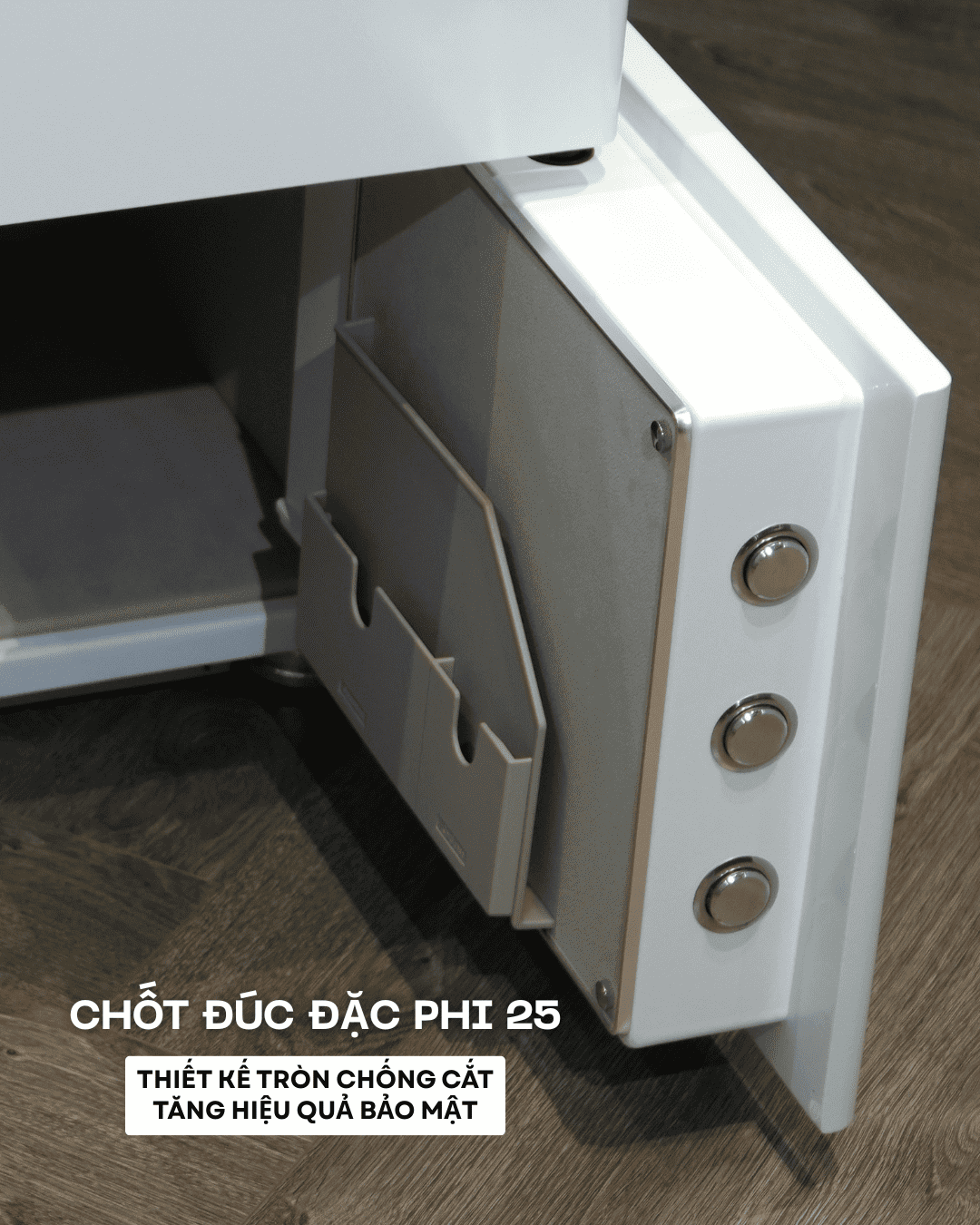 Chống cháy & chống trộm: Thân két bằng thép đặc đúc nguyên khối, cửa két có 3 chốt tròn 25mm siêu chắc.