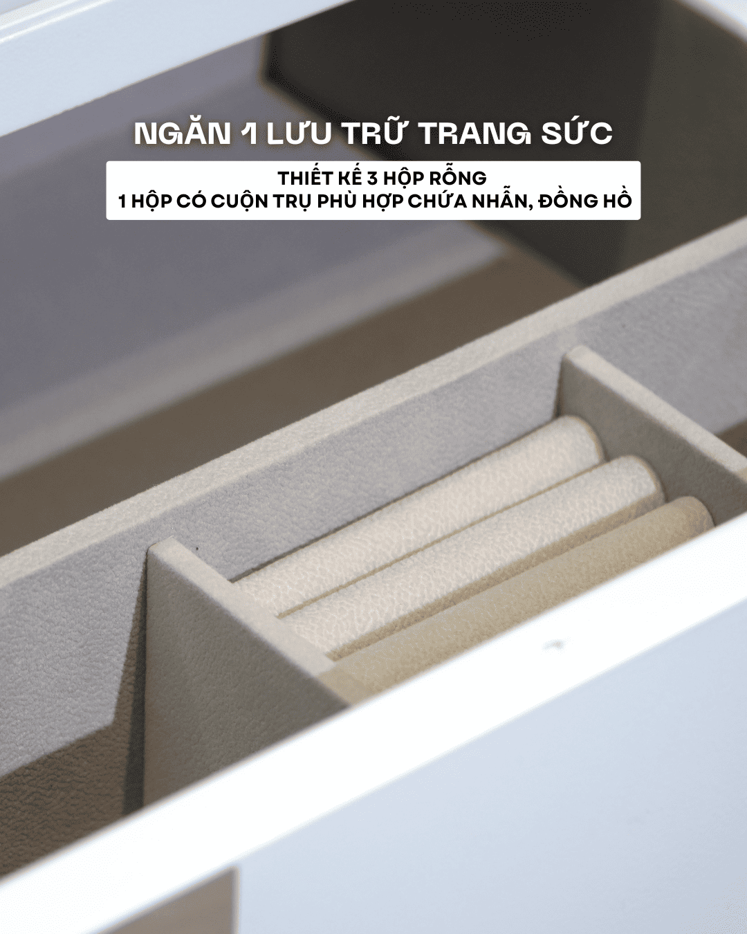 Ngăn trên lót nỉ cao cấp, phù hợp để trang sức, đồng hồ, giấy tờ quan trọng.