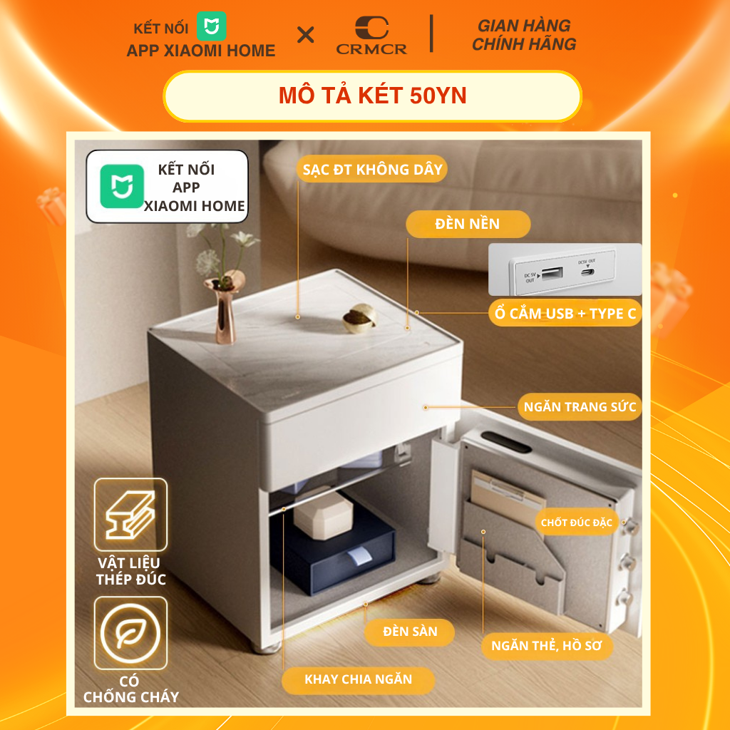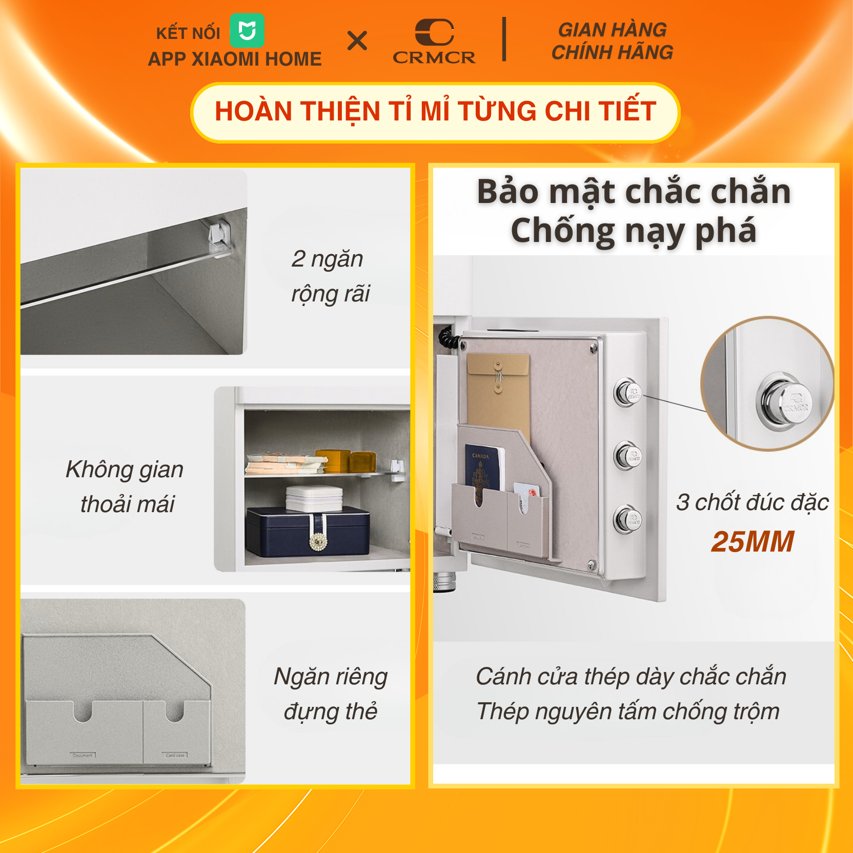 Két Sắt Xiaomi CRMCR 50YN bản quốc tế nổi bật với thiết kế hiện đại, khóa vân tay điện tử siêu nhạy, kết nối Xiaomi Home cho phép quản lý két ngay trên điện thoại. Kết cấu thép đặc nguyên khối cùng chốt đúc phi 25mm giúp sản phẩm chống cháy, chống cạy phá tối đa.
